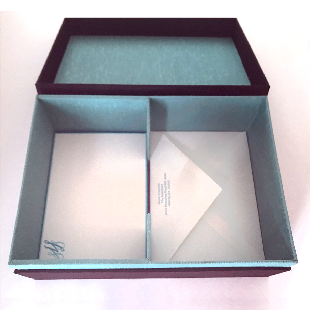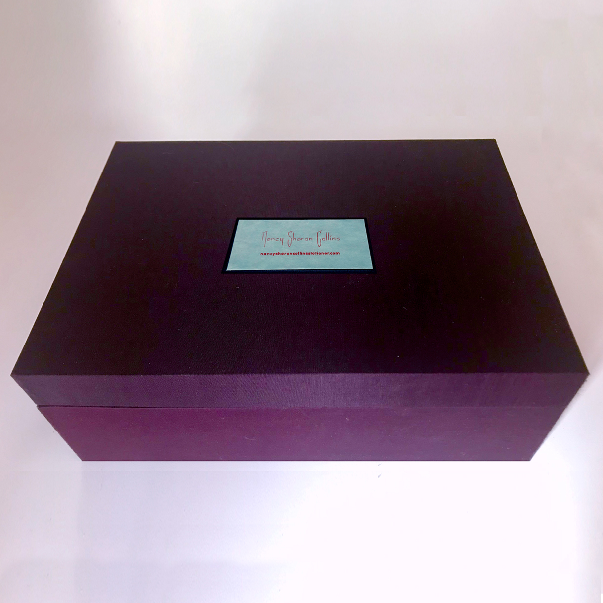 Custom-built to hold the optimum number of sheets, cards, and envelopes, ours are built by highly skilled, archival, book arts-artists. Choose the iconic Nancy Sharon Collins, Stationery packaging colors as shown. Or personalize the outer and inner, silk, book cloth to suit your taste and match your stationery.