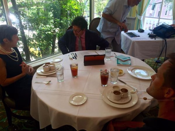 Out to Lunch, hosted by Peter Ricchiuti, was recorded Tuesday, 7/7/15 interviewing stationer extraordinaire Nancy Sharon Collins talking about hand engraved stationery. Check-out this great photo of the interview at Commander’s Palace, it illustrates some of the good food and convivial conversation!